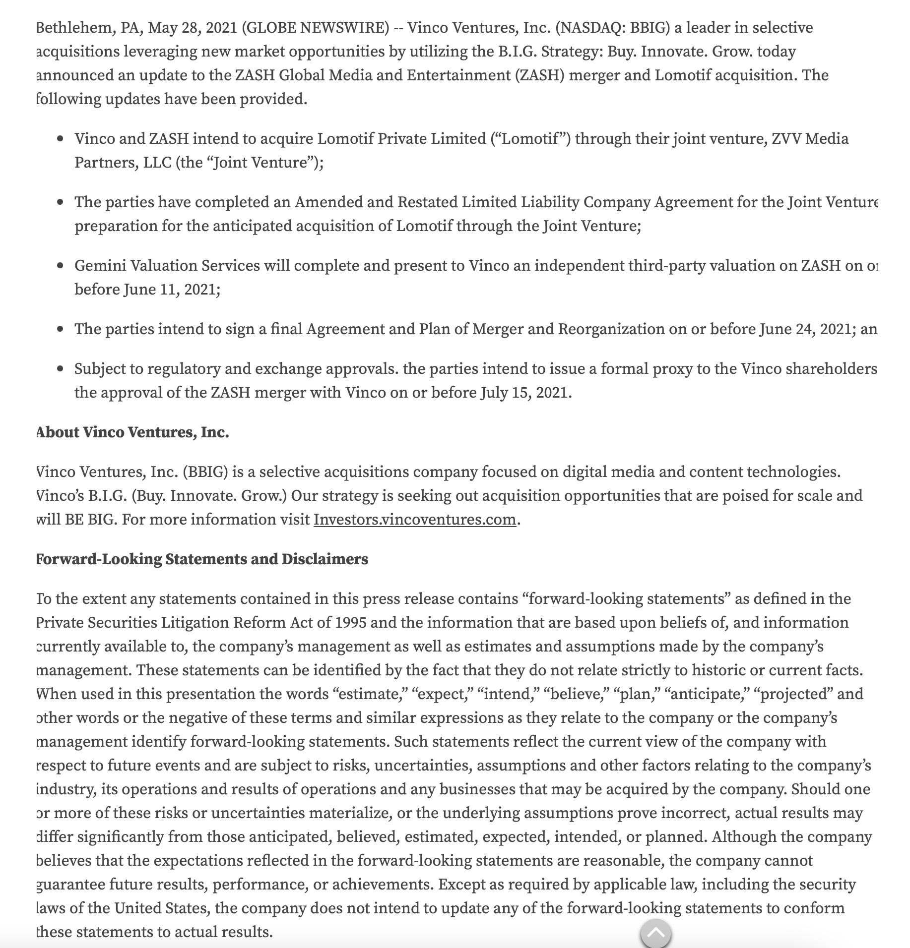 Web Bethlehem PA Sept. In effect Zash will become the controlling company although it will retain the Vinco Ventures name and the BBIG stock. Most have been waiting all week Even since August 21st for the Proxy announcement.